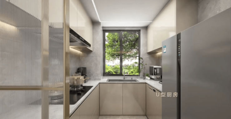 厨房U型操作台面,操作空间充裕;更值得点赞的是预留了双开门冰箱位置,你要知道普通百平米三房,基本只预留单体冰箱的空间。