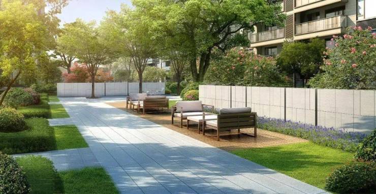 项目通过贯穿南北的纵向景观轴串联三条生活横轴,汇聚了入口庭院、阳光草坪、迎宾会客厅、儿童乐园、林荫阅读区、健康步道、休闲廊架等全龄互动空间,满足不同群体的要求。