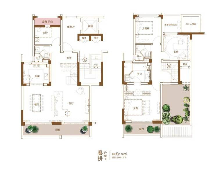 户型建筑面积约170㎡上、下叠拼: