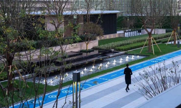 健身跑道在自然中穿行,同时融入多种活动功能,可慢跑、健身,传递灌输健康慢生活的理念。植物、水镜、景墙交织入画,层层绿意从视觉上无限延伸。整个场景形成曼妙的艺术空间。