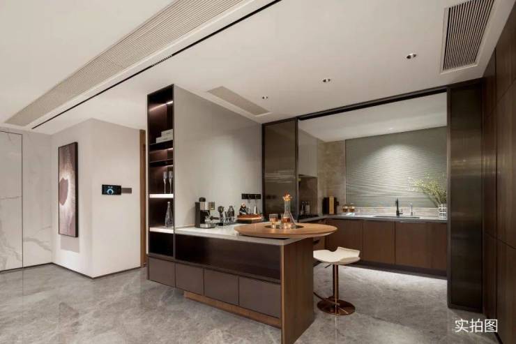 墙面更是大量使用了胡桃木色饰面+定制的墙布硬包。
