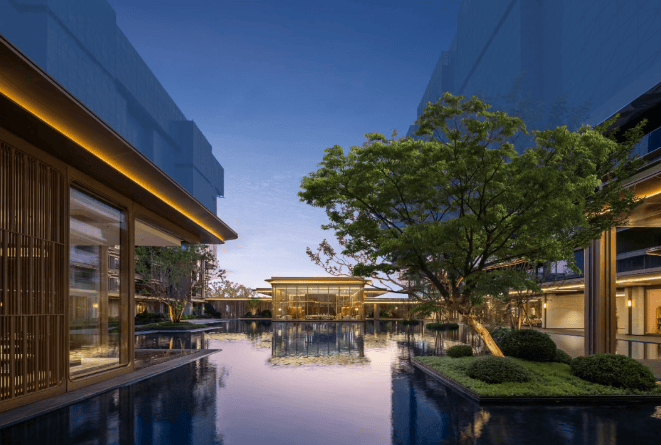 建筑设计:抬高约 2 米打造悬浮式环水岛居,规划 “低密洋房 + 当代逸墅” 纯粹住区。洋房采用 “超流体” 美学立面,阳台进深最大 2.8 米,270° 广角观景视野,私密性高;当代逸墅配备独立入户门厅及最大约 400 平方米私家花园。