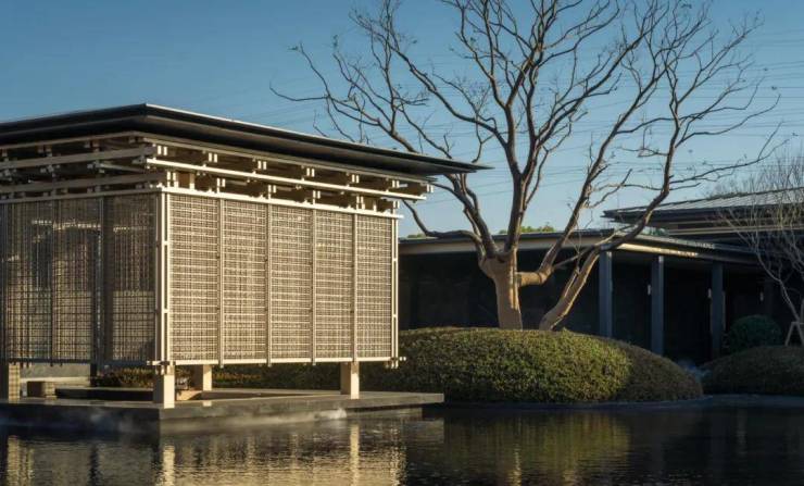 竹荫刹刹,清风徐徐, 翠绿的松树与现代建筑相得益彰,勾勒出一幅既典雅又现代的画卷。松风拂面,水月悠悠,仿佛令人置身于诗意的山水画中。