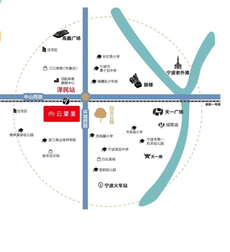 云望里位于海曙区白云街道白云公园西侧,距地铁1号线泽民站仅约300m(规划8号线换乘站),宁波主城核芯区地铁沿线稀缺地段!
