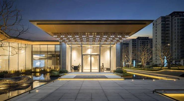 建筑的外立面我们采用了极具中国特色的山水格栅,以光影与仿木质钢结构相结合勾勒出山水剪影,内敛而静谧、自然而隐逸展现的东方气质。以克制的手法及对线条的简约处理,完美的将东方美学与现代艺术相融。