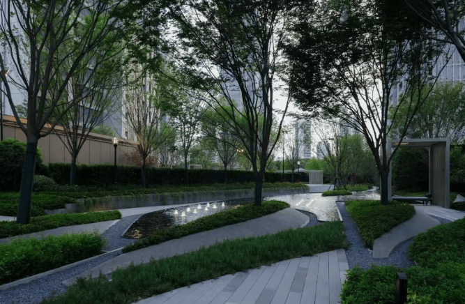 景观设计:以社区资源的均好性设计,规划两轴一心四园四组团,通过围合式布局形式、无楼王设计、花园集群,将空间最大化让渡给自然,创造友好的生活界面。