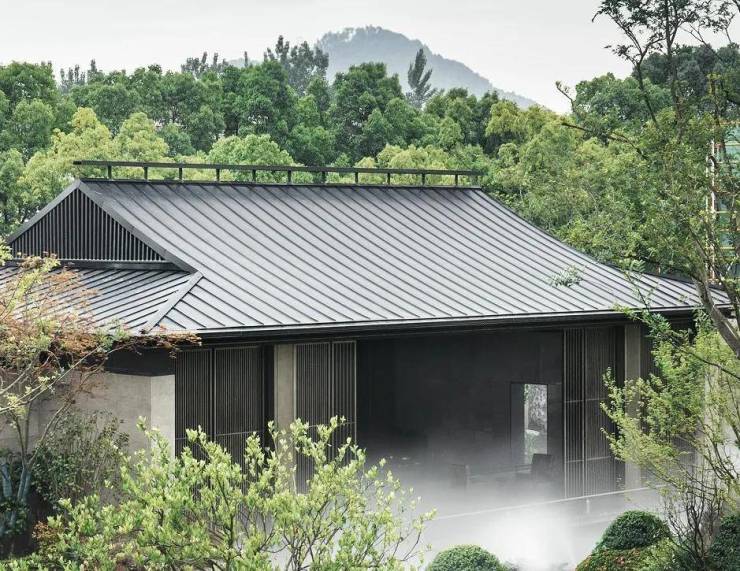 满园在意境和形制上对传统园林和建筑进行借鉴,在材料和工艺上,则采用了完全现代的建构语言。凯撒灰石材墙面和深色金属瓦屋面筑定了整体沉着大气的基调,进一步用木纹金属吊顶、金属格栅和栏杆勾勒工艺细节。造园叠山则选用了黑山石,与整体氛围更为融合。