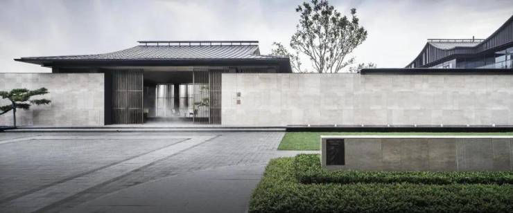 前场借会稽山为远景,在原有红线的基础上,将入口花厅和景墙进行了谦虚的留白退让,形成敞开式迎宾空间,东侧浣江路的香樟行道树自然形成前景。将停车区设置于前场的北侧,引导来访者沿着路径望向视线尽头的会稽山。以宋代歇山顶为原型的入口花厅,高7.34m,檐口长18.4m,宽12m,与端景处的灌木球和迎客黑松,在水平延展的围墙前,构成一幅不施繁饰、自然典雅的中式画卷。