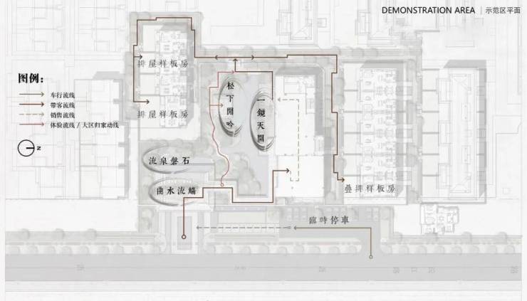 本次呈现的示范区位于“L”型景观主轴的东部起始处,是整个项目的主入口园林,属于“外园”,将来会被所有业主和外来消费的人群所共享。北侧的二层建筑暂时用作销售场地,在交付后将作为经营空间为本区域提供生活服务。由于近远期不同的使用模式,场地天然形成两条动线需求,在销售期两条动线相联成为一条体验和游园环线,在交付后则分为业主归家和经营空间两条内外动线。