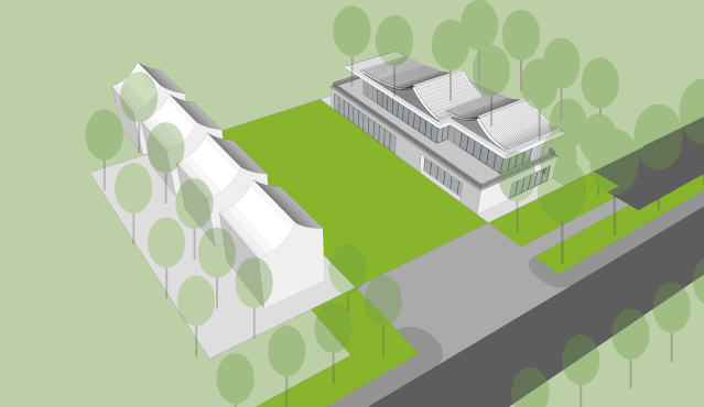 第一次来勘地,离基地还有几公里,已经能看见葱茏的会稽山和其上矗立的大禹像。这个区域由于景区的视线控制因素,有严格的建筑高度限制,周围的建成区域均是掩映在绿荫之中,与会稽山古老而宁静的姿态并存。基地东临浣江路,北至嵊山路,南侧与绍兴二环路留有米宽的绿带。东侧、北侧道路都有种植时间久、姿态茂盛的双侧香樟行道树,给予基地优良的微观现状环境。