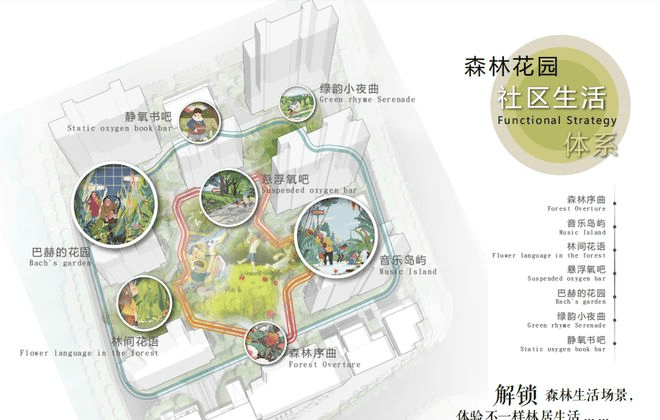 林间花语、森林序曲、音乐岛屿、悬浮氧吧、绿韵小夜曲、静氧书吧、巴赫的花园等生活场景穿插其间,达成每家每户都能坐享社区景观的目的。