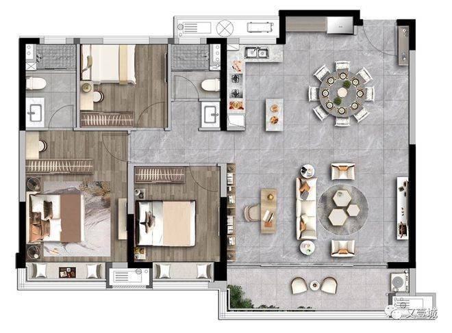 这是一款稍一琢磨,就能发现很多惊喜点的户型。比如连通南北的主卧+超大转角飘窗,比如三个房间最小面宽也达到了约2.95米的尺度,用作卧室丝毫不会拥挤等等。