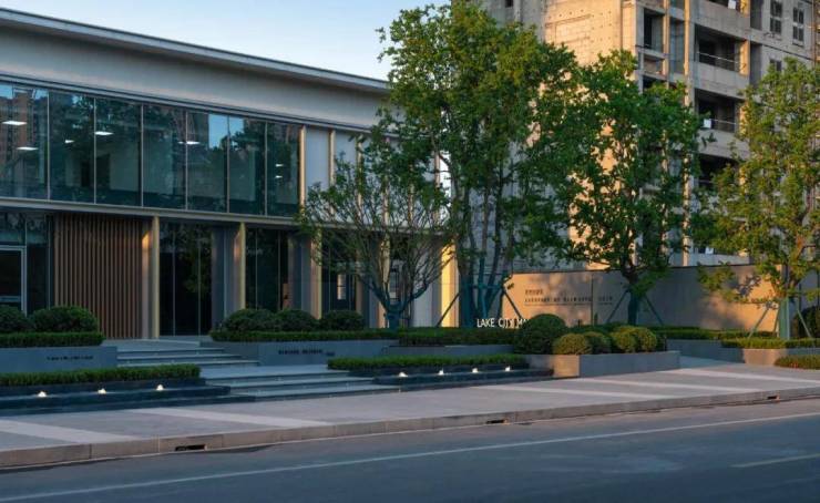 层层水景与种植池以直线形式相互结合,现代简约的质感于各中体现。阳光透过树梢洒在景墙之上,树影随风摇曳,为空间平添几分朦胧之美。