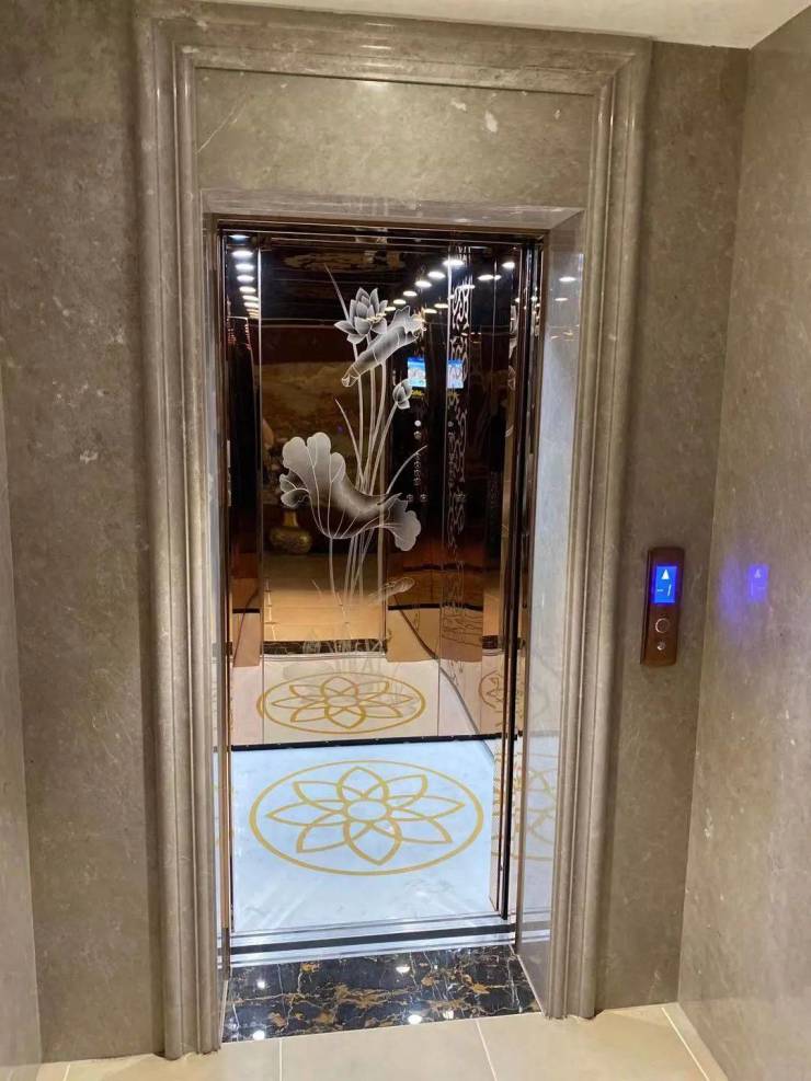 根据业主家里装修风格,伊萨电梯专门设计了一台4层4站4门400公斤的荷韵吉祥的别墅电梯。整个轿厢的装修风格选用简洁亮丽的玫瑰金镜面不锈钢加玫瑰金镜面蚀刻莲花的镜面轿厢,简洁而华贵,轿厢空间放大。轿厢拼花荷花大理石,轿顶祥云蚀刻。电梯配置ARD断电平层应急救援装置、一键呼叫功能,卧式迷你小型永磁同步主机,呈现绿色智能的别墅电梯享受。