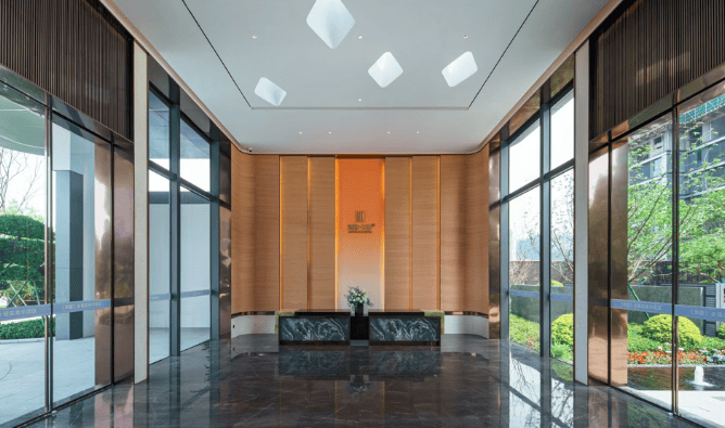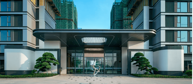 建筑与园林设计:采用极简“L”型超纤细铝板线条,融合大面玻璃(三玻两腔)、石材等高级质材打造寰幕立面,营造“天空之翼”建筑封面。约2.2万平方米的中央园林,以200米景观中轴串联下沉庭院、镜面水景与四季花园,配备680米环形跑道、下沉式恒温泳池、半场篮球馆等设施,构建“小奥体”式活力场域。