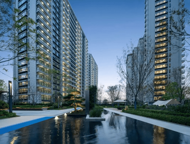 景观与建筑融合:外立面采用公建化新中式风格,结合几何折线、纤细窗框等设计元素,与学院派主题园林相呼应,整体风格简约大气,提升社区品质感。
