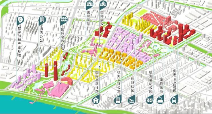 片区内规划有居住、休闲购物、商务办公、科创研发等功能,还特别配套了国际会展中心、国际学校和国际医院。