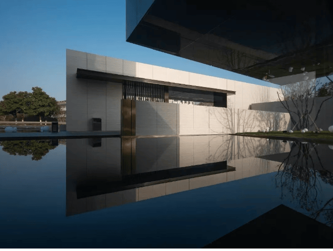 建筑设计:采用现代简约新亚洲风格,立面以米白色为主调,辅以咖色搭配,运用高透玻璃营造光影折射效果,采用真石漆塑造质感肌理,三段式构图,顶部设有挑檐,中部为光影立面,下段是基座,整体建筑色彩明快,精致美观。