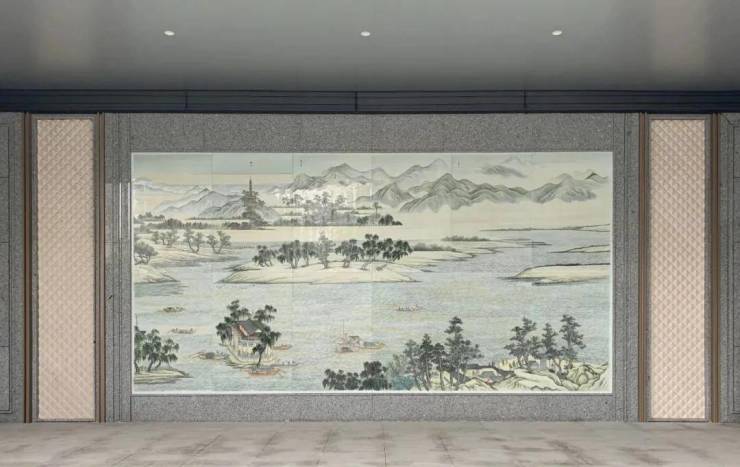 延续建筑屋顶为原型的入口门厅,在水平延展的围墙前,搭配整版《康熙南巡图第七卷》瓷板画,瓷板画邀请景德镇著名大师执笔手绘,定版烧制,画面栩栩如生,增加了入口的仪式以及奢华之感,构成一幅不施繁饰、自然典雅的画卷。