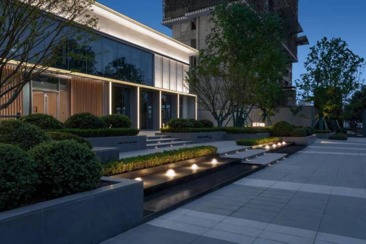 层层水景与种植池以直线形式相互结合,现代简约的质感于各中体现。阳光透过树梢洒在景墙之上,树影随风摇曳,为空间平添几分朦胧之美。