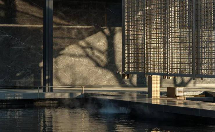 文会厅以下沉式观景会客区配合层叠的水景,加上大面积的观景落地窗,营造出属于东方精神的生活雅趣,往来天骄,高邻同语。在这里会客观景,读书喝茶,有别样的安静和美好。