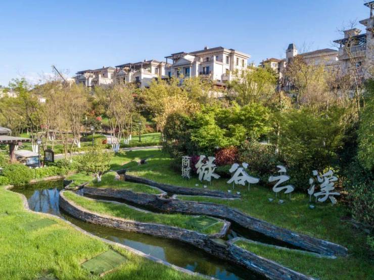 依托自然山水和高差之势,绿谷云溪分别在欧陆山墅中部组团和东侧山体组团构建溪谷和台地公园,与入口处绿谷公园共同围合成林地起伏、溪水环绕的场地核心景观,中部区域打造小尺度的花园式景观,使得每个组团都拥有专属的公园体系。