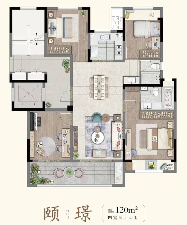 建面约120㎡洋房(四室两厅两卫):经典四叶草户型,三开间朝南双阳台,LDKG一体化设计,主卧大套房,可以随着家庭成员变化灵活调整,想象空间非常大。