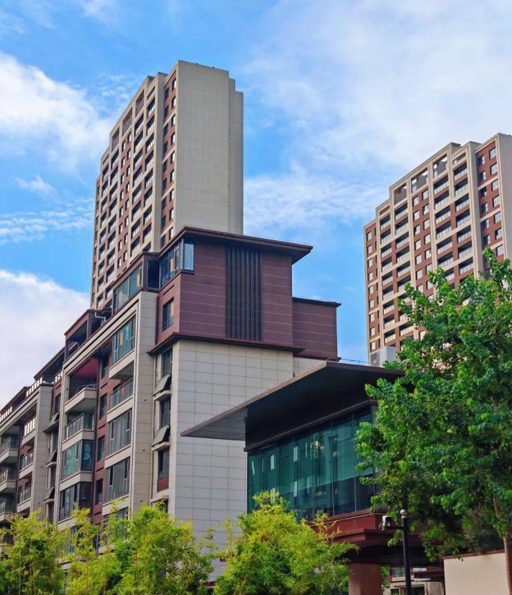 立面上:新中式风格建筑, 极具辨识度,加上大面积的玻璃窗在阳光照射下更璀璨夺目、高贵典雅。