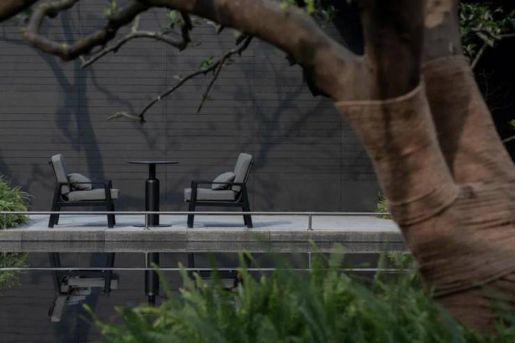 示范区中庭镜水面与廊架围合空间连接起售楼处与样板间。环廊抱水,长庭闲集,感受水林交融的山林意境,舒适的林隐包裹,自由惬意的水境氛围。硬朗的石材与柔软的卡座软包,搭配层叠出挑极富律韵感金属雕塑,规整的线型绿植使得整个空间的层次感和视觉感更加丰富细腻。