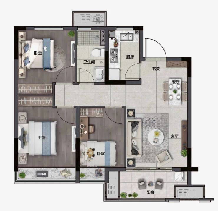 在约80㎡的空间内,打造三个独立房间,一定程度上可满足从一孩到二孩的需求,为家庭生长预留空间。