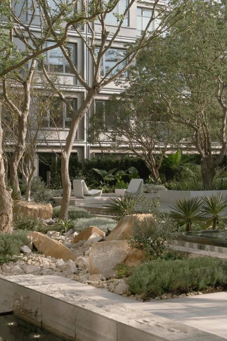 在立面、细节、材质以及植物的布局上进行匠心雕琢,还通过空间结构的巧妙设计,创造出一个层次丰富的景观美学空间。线条、材质、对景,让人在行进之中体会到静谧中高雅、永恒的美感。