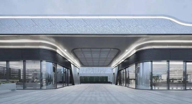 运用材料的搭配和细部节点推敲,营造未来科技感。通过软件模拟与工厂预制相结合,用渐变的穿孔铝板形成逐渐变化的视觉肌理,铝板的排列组合与充满动感的建筑外形相结合,使示范区仿佛在不断的起伏变化。