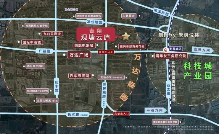 城市动脉:距嘉兴市政府直线距离 6 公里,处于南湖 CBD 与高铁新城双核驱动范围内。