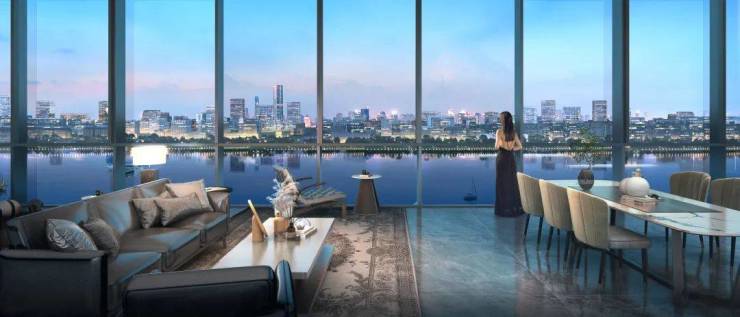 楼盘的建面约300㎡-330㎡,一脉三江口,面朝东部新城,南向一线江景,可谓是稀缺资源中的珍宝。宝龙文创甬江城位于文创港核心区,距三江口仅3公里,拥有南向一线江景稀缺资源,类比杭州钱江新城、上海北外滩,区位价值优越。楼盘周边的万象城、来福士广场、龙湖天街等商圈配套设施齐全,生活便利,交通、医疗、教育资源也非常成熟。地铁3号线中兴大桥南站距离楼盘仅850米左右,方便居民出行。一江三公园,一线全南观江面,让人可以尽情享受极致的视野和生活品质。