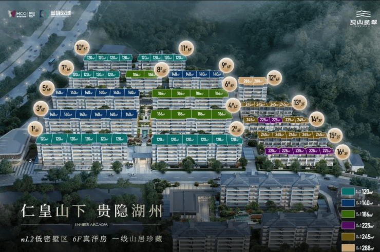 产品类型:包括 293 套山居洋房、6 套揽山叠墅、19 户现代东方合院。洋房建面约 120-185㎡,总高 6 层,一梯两户,一楼带花园带地下夹层;合院建面约 220-240㎡,地上三层,地下一层,花园面积 70 平方米左右,东边套花园面积 142 平方米左右。