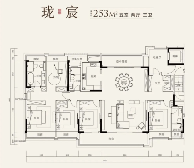 建面约253㎡,五室两厅三卫:南北双阳台,主卧内包含一个小书房,如果家庭成员少的话也可以改造成衣帽间。