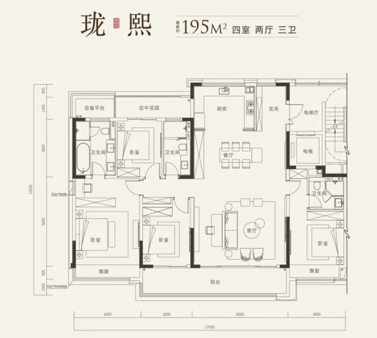 建面约195㎡,四室两厅三卫:有约6㎡的独立电梯厅可以使用,面宽约17m,双套房更方便家里老人居住。主卧升级为双台盆并配有浴缸,同时边户还有一扇窗户可照进自然光,作一个女主人的梳妆台十分合适。