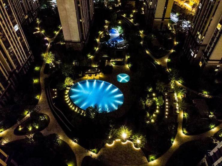 由超大泳池及各节点花园所组成的中央景观花园种植不同质感的植物,环绕自然水池、座椅和中央廊架,营造鬱鬱葱葱的软景空间。上层选用了整齐围绕泳池的银杏林;中层则多用当地的开花灌木;林下搭配种植杜鹃花、茶梅等各种开花灌木。