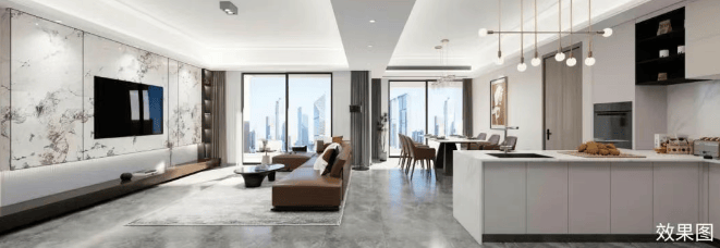 交付标准:精装修,配备新风、地暖和中央空调 “三大件”。
