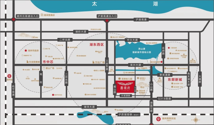 立于黄金中轴吴兴大道南侧,链接中兴大道,路网纵横交通便捷,同时沪苏湖高铁将在2024年通车,此后将极大提高城际交通网的便利性。