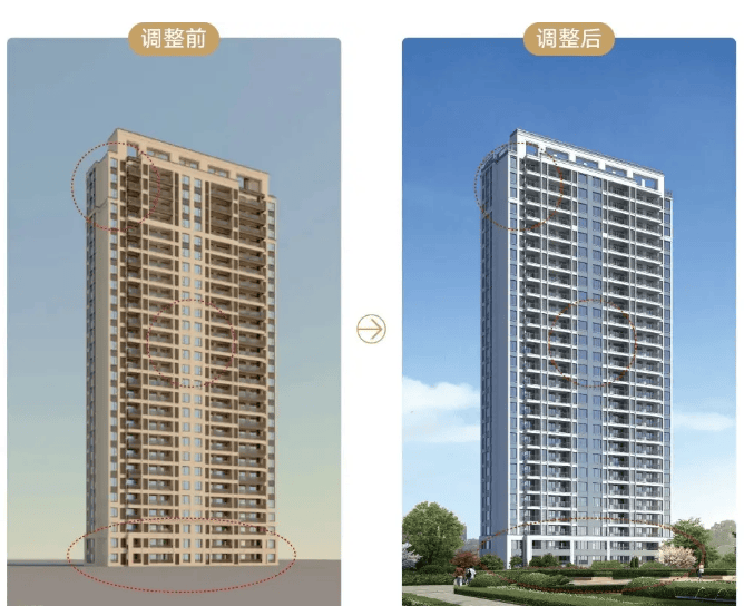在建筑外立面上,明月澜园不惜提升工本造价,旨在打造更符合现代审美的建筑外观。首先,将底部石材进行调整,适当削减了整体建筑的厚重感,在视觉上更加轻盈时尚。在此基础上,更将原三层及以上咖啡色涂料调整为浅灰色涂料,米黄色真石漆调整为米白色真石漆。调整之后的配色将更加具备现代简约的气质,整体建筑明媚靓丽,以焕新之姿点亮京口的城市天际。