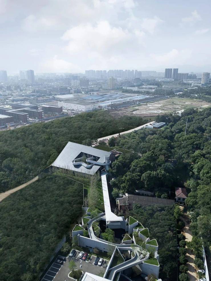 在这个独一无二的场地上,建筑根据现有条件延续设计。正如建筑师团队名字MonsterLAB所展示出的设计理念,城市、建筑被赋予生命,“山水”“生态”的话题被反复强调。