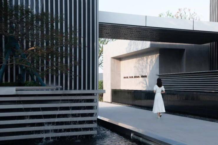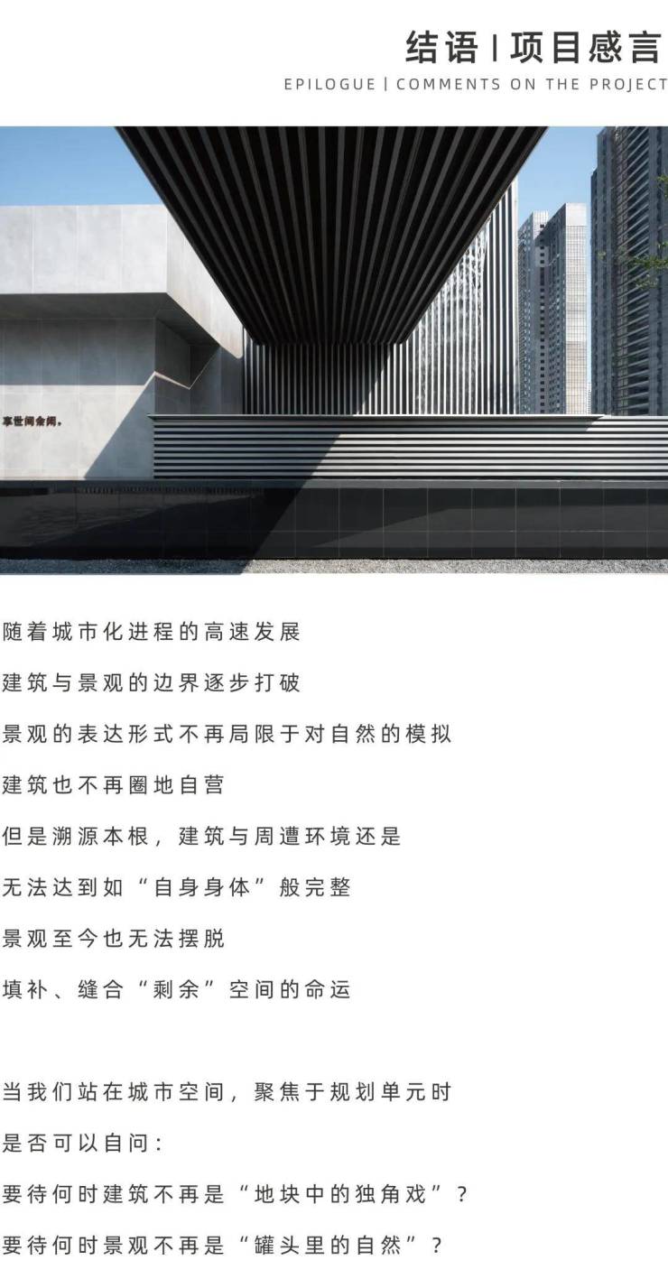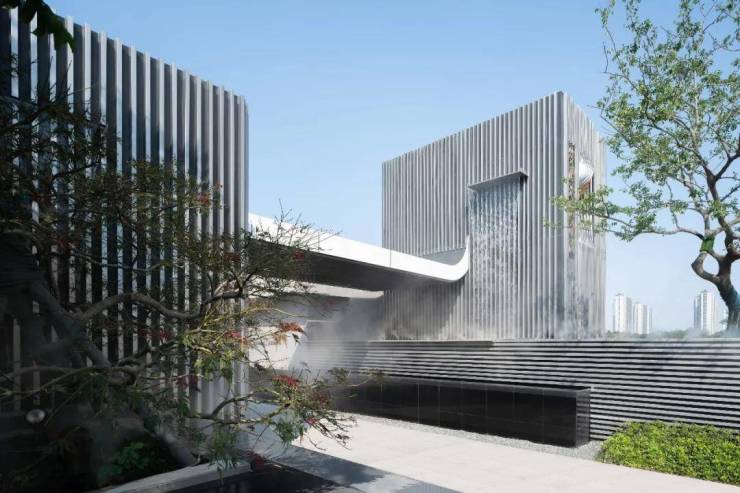 根植于山水自然精神与文化价值,我们从场地出发,宏观上延续山水城市文脉肌理;微观上,以山体、水体等自然要素为切入点打造自然体验空间,融入横向线条、纵向线条、立体结构与置入留白意境等设计手法,赋予山水城市景观建筑语言的意义。