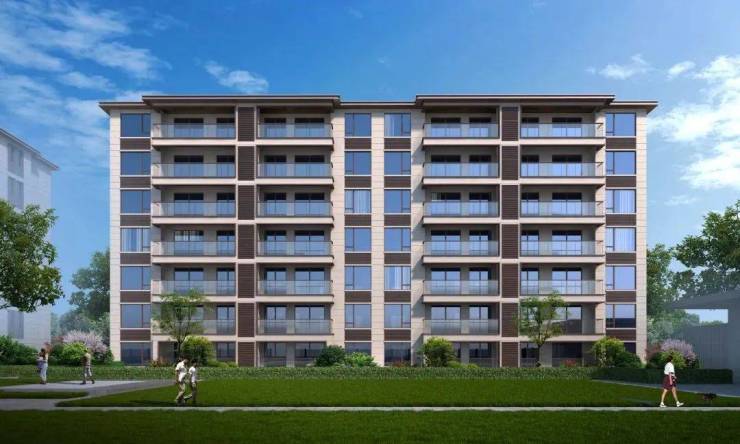 建筑设计:项目规划 6 栋 7 层和 2 栋 8 层洋房,外立面采用现代简约风,建筑主体采用米色真石漆,顶部挑檐设计,线条简洁,配色清爽。