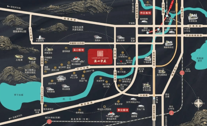 教育:项目自身配备 5000 多平方的幼儿园,周边有溪口中心小学、剡溪中学、溪口中学,省二级重点高中武岭中学。