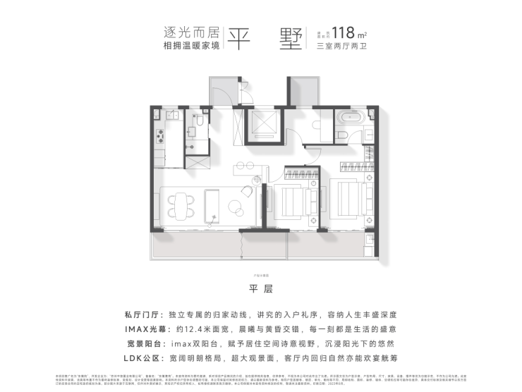 定制空间:全横厅设计、LDK多功能家庭区;功能间配置+灵动空间设置;建面约135㎡以上户型,全3卫配置,居住品质更高。