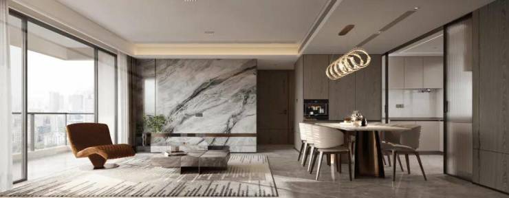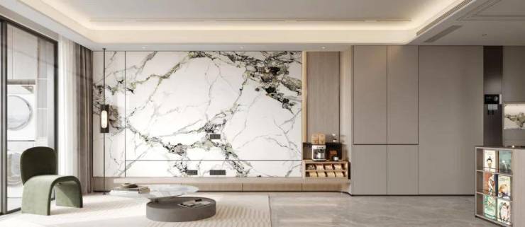 当你归家步入地上大堂,映入眼帘的便是精致细腻的岩板背景墙,其独特的自然纹理和色彩仿佛将大自然的美景引入室内,带来一种静谧而奢华的氛围。