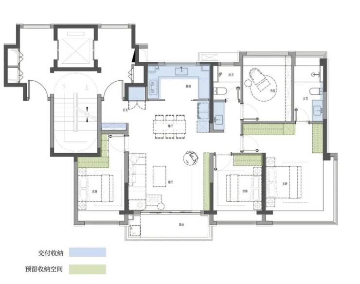 建面约144㎡的四房户型,还更进一步,配备了隐藏式的独立储藏空间,设计非常巧妙且实用,既满足了大量物品的存放需求,又保持了室内空间的整洁与美观。