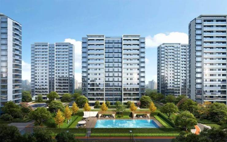 公共空间:设有酒店式入户大堂,挑高精装空间里布置多个会客区;北面次入口有金属铝板挑檐,搭配景墙、松树和石狮。园区内有度假风游泳池,还有约 350 米元气跑道、约 300 米景观纵轴等。