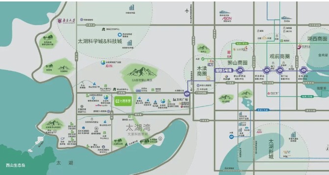 景观设计:项目整体格局背山靠水,周边有不可复制的环境资源,北靠穹窿山(5A 级风景区),南临太湖,内部景观与外部自然环境相融合,营造出宜居的生态氛围1。